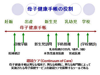 母子手帳という形で医療や健診のデータを保護者が持つことによって、異なる場所で、異なる専門家によって、行われた母子保健サービスが、一貫性を持つことができるようになります。これが母子手帳のすばらしい役割です。まさに、母子手帳は、切れ目のない継続ケアを保証するシステムと言い換えることもできます。