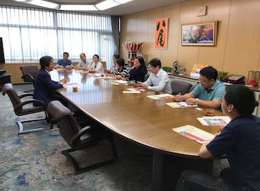 八尾市役所で、田中市長から市政について話を聞く様子